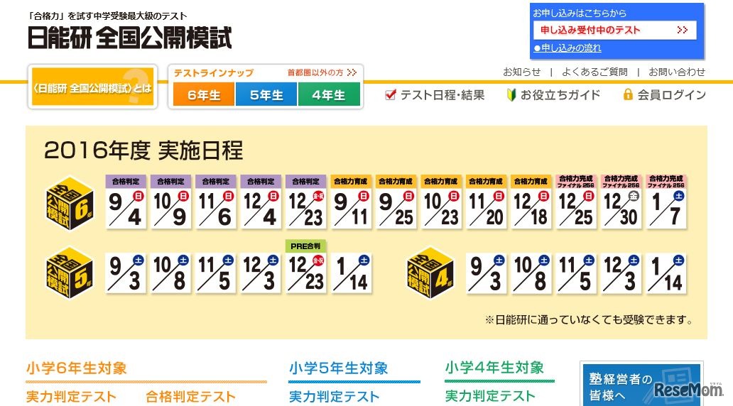 日能研は10月9日開催の小学6年生対象「合格判定テスト」と、10月8日開催の小学4・5年生対象「実力判定テスト」の申込受付を開始した。外部会場では小学6年生の保護者を対象に、最新志望者動向などを解説する保護者会も同時開催する。