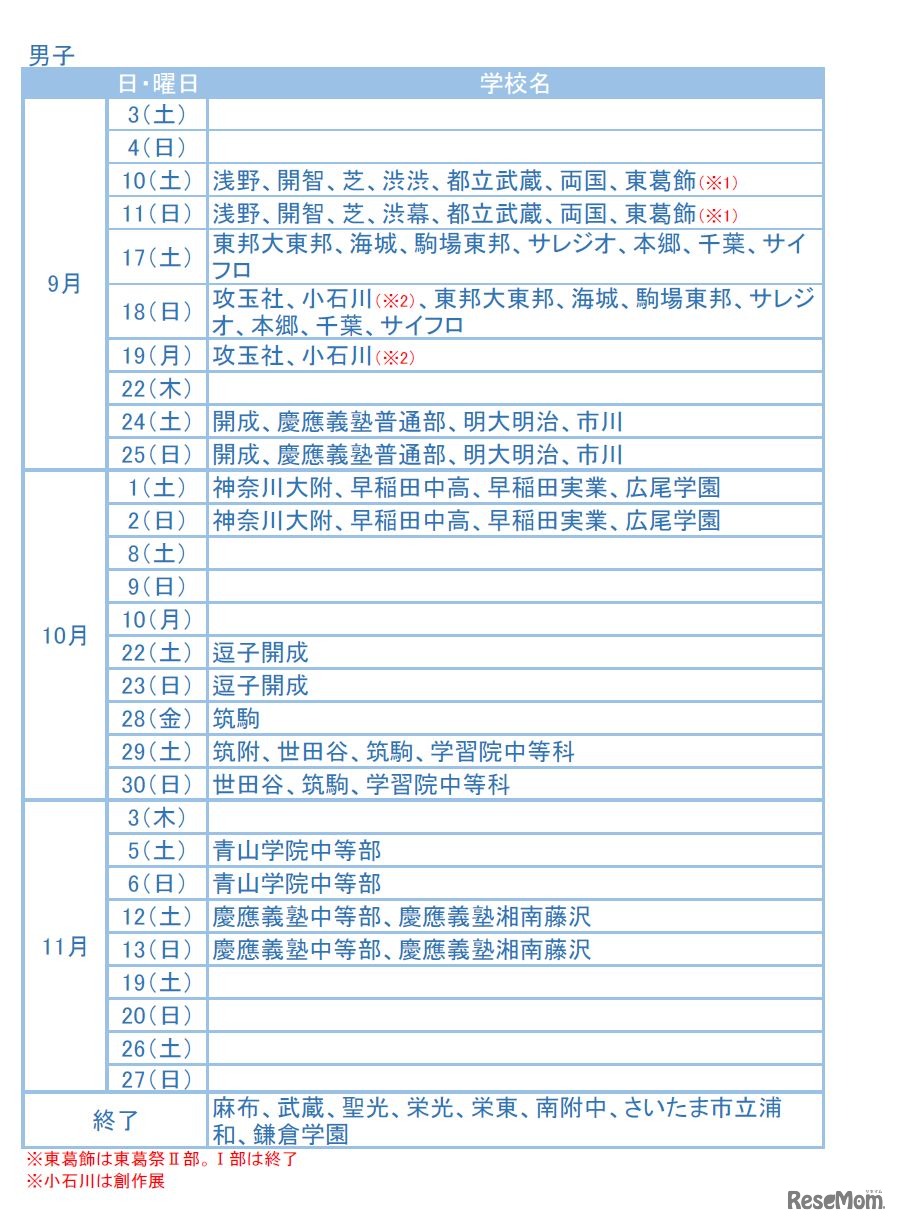 秋は多くの私立中高一貫校で文化祭が行われる季節。中学受験を考えている親子にとっては、志望校や未来の先輩たちを間近で見るチャンスだ。首都圏の人気校を中心に、これから行ける2016年の文化祭・学園祭日程を男女別に紹介する。