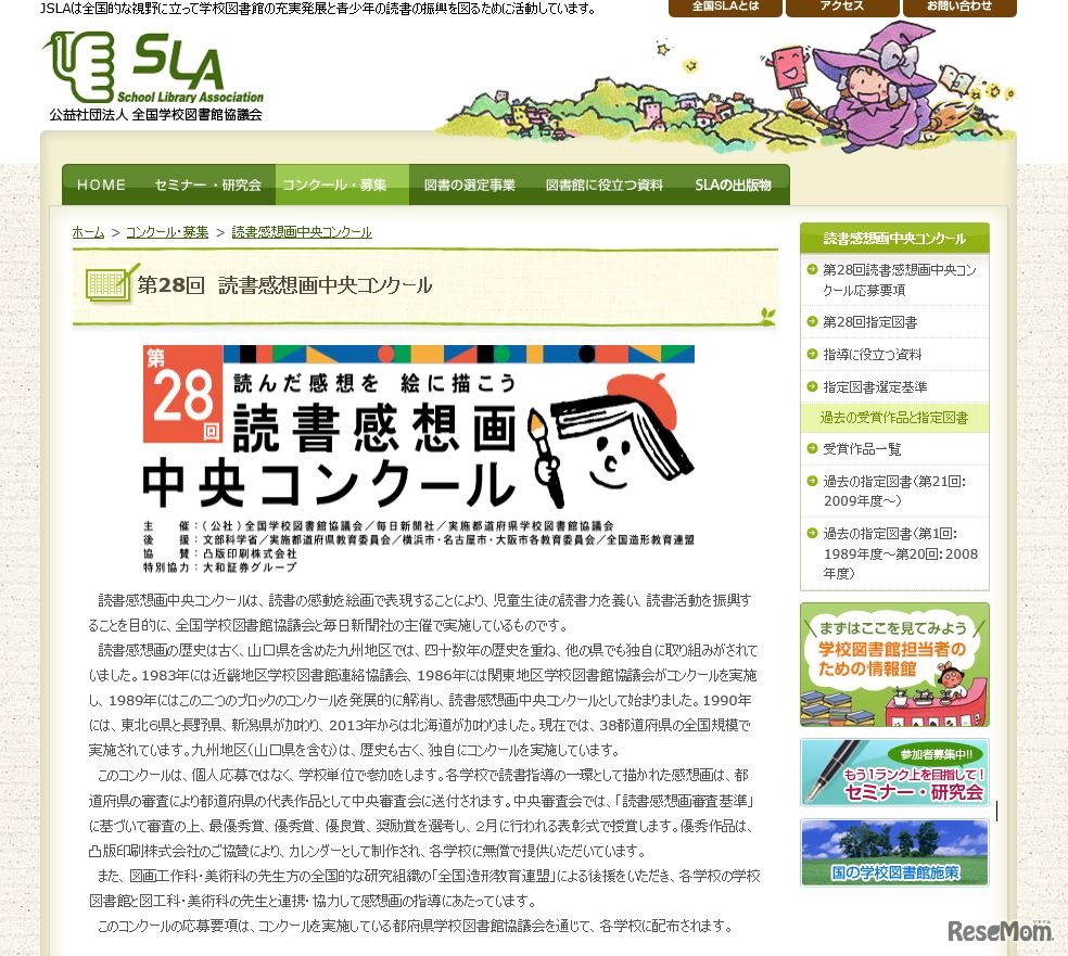 全国学校図書館協議会・毎日新聞社・学校図書館協議会は、「第28回読書感想画中央コンクール」を実施する。読書によって得た感動を絵画として表現して応募する。応募資格は、小学生・中学生・高校生の満20歳以下の者。実施地域は、山口県、九州地区を除く38都道府県。