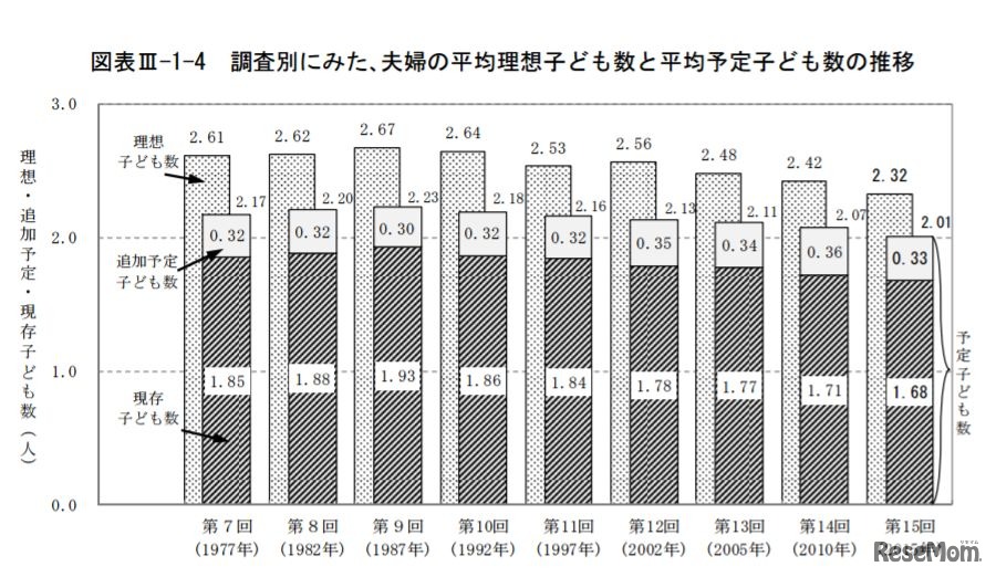 夫婦の平均理想子ども数、平均予定子ども数はいずれも低下し、過去最低となったことが、国立社会保障・人口問題研究所が9月15日に発表した調査結果より明らかになった。理想の子ども数を持たない理由は、過半数が「子育てや教育にお金がかかりすぎる」と回答している。