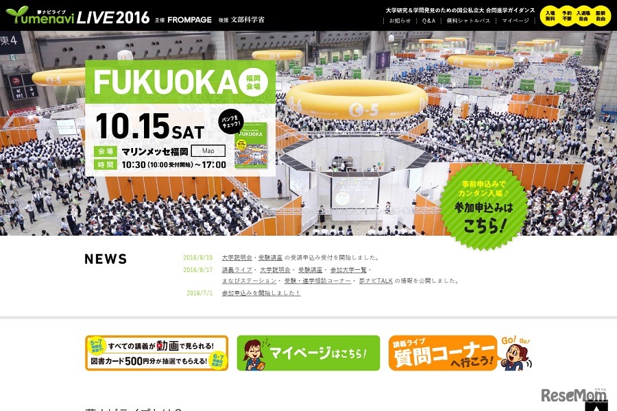 高校生と受験生、保護者のための進学ガイダンス「夢ナビライブ2016」が10月1日に仙台、10月15日に福岡で開催される。入場は無料。事前申込み不要。個別相談や、大学教授による学問のミニ講義などを実施する。