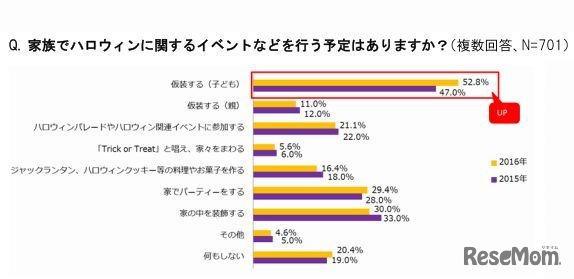 2016年のハロウィンは、8割以上の家庭が仮装など何らかのかたちでハロウィンに関わる予定をしていることから、ハロウィンの大衆化がさらに広まっていることが、アクトインディの調査結果より明らかになった。仮装衣装の購入先は、約8割が100円ショップだという。
