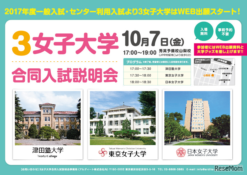 津田塾大学、東京女子大学、日本女子大学の3女子大学が、合同入試説明会を開催する。対象は受験生、高校1・2年生、保護者、進学担当の教員で事前予約不要、入場料無料。