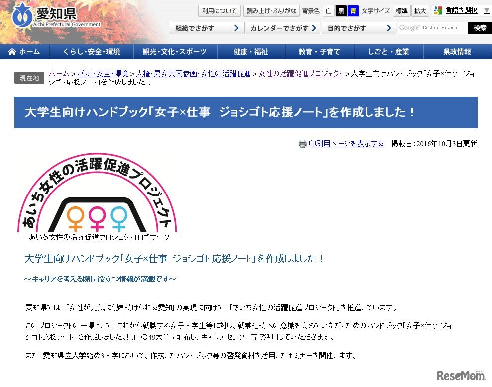 愛知県は10月3日、大学生向けのハンドブック「女子×仕事 ジョシゴト応援ノート」を作成し、内容を公開した。女子大学生が就職やキャリアを考える際に役立つ情報をまとめた冊子で、今後県内の49大学に配布されるほか、一部の大学ではセミナーを開催予定だという。