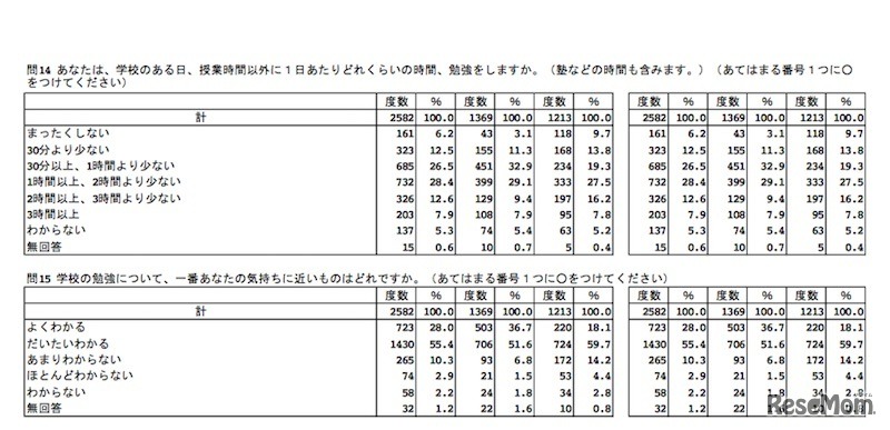 学校以外での勉強や学校での勉強について(子ども調査:度数および%の数値は左から、全体・小学5年生・中学2年生)