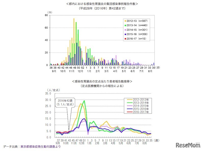 東京都は10月27日、ノロウイルスなどによる感染性胃腸炎の流行シーズンを前に注意喚起を行った。今シーズンの患者報告数は、第42週(10月17日~23日)で5.1人/週となっており、昨年同時期の4.6人よりやや高い数になっている。例年11月以降、患者報告数が増加する傾向。