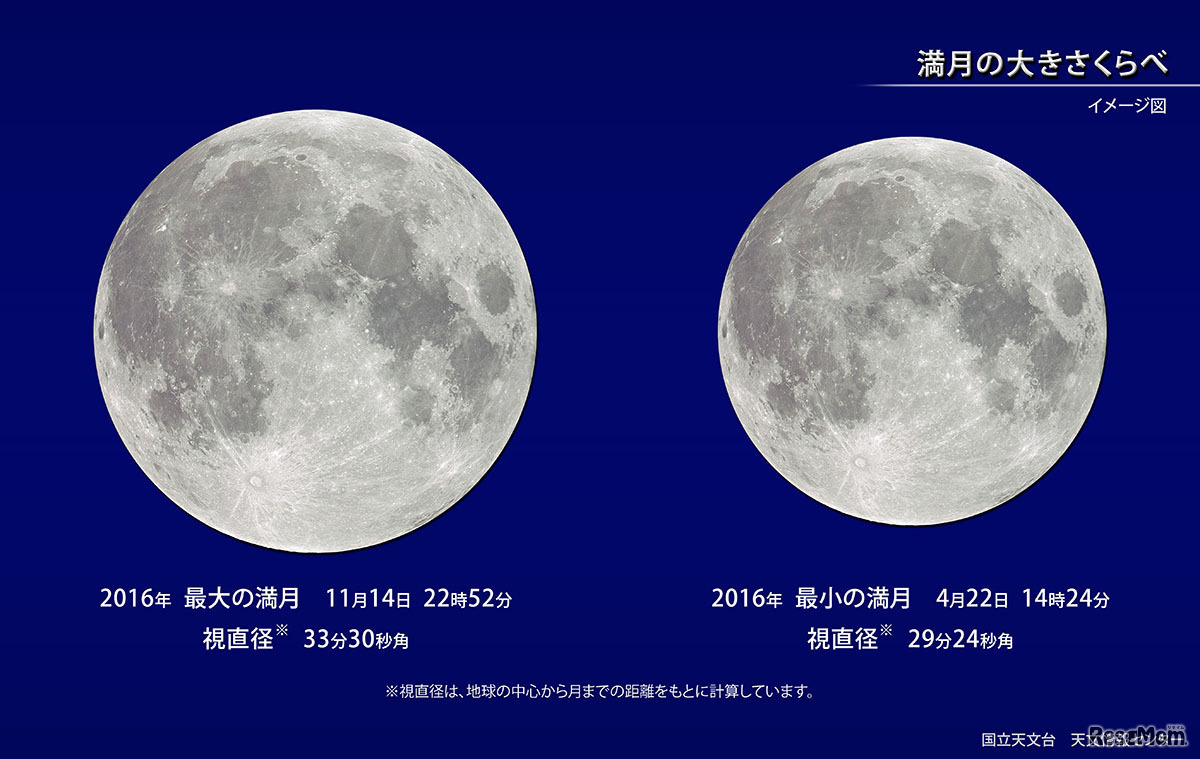 1年の満月の中でもっとも大きく見える満月「スーパームーン」が、11月14日に訪れる。月が最大となる時刻は午後10時52分。国立天文台では、2016年最大の満月とともに、表面のようすがわかりやすい上り始めの月も観察して、月の模様を楽しんでほしいと紹介している。