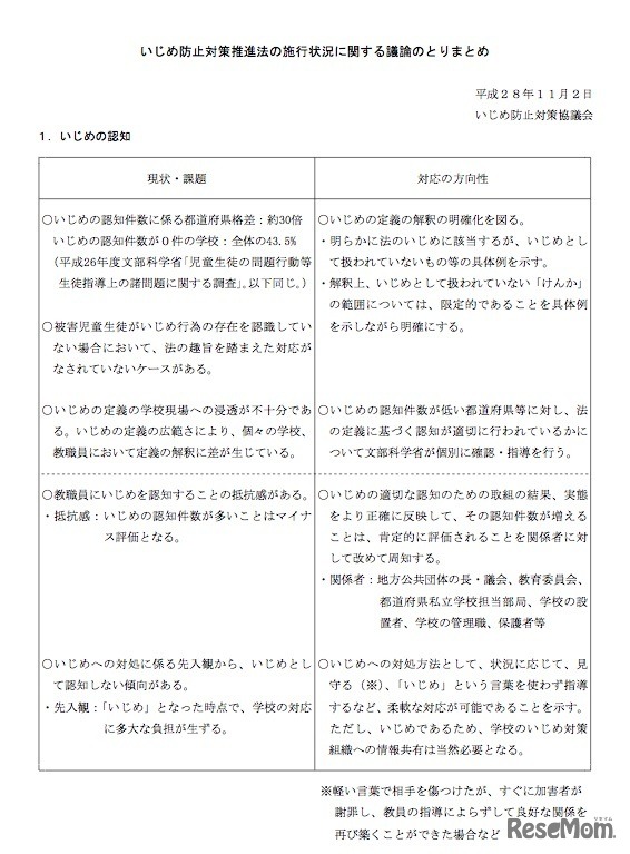 文部科学省は11月2日、いじめ防止対策推進法の施行状況に関する議論のとりまとめを掲載した。いじめの定義の明確化のほか、教職員の日常業務において、自殺予防、いじめへの対応を最優先事項に位置付けるよう促す考えなどを示した。