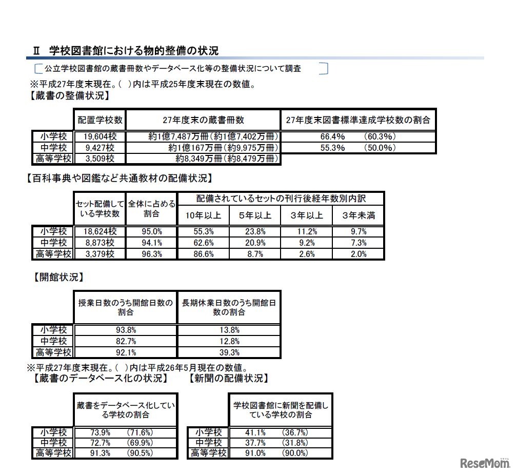 学校図書館における物的整備の状況 平成28年度「学校図書館の現状に関する調査」結果について