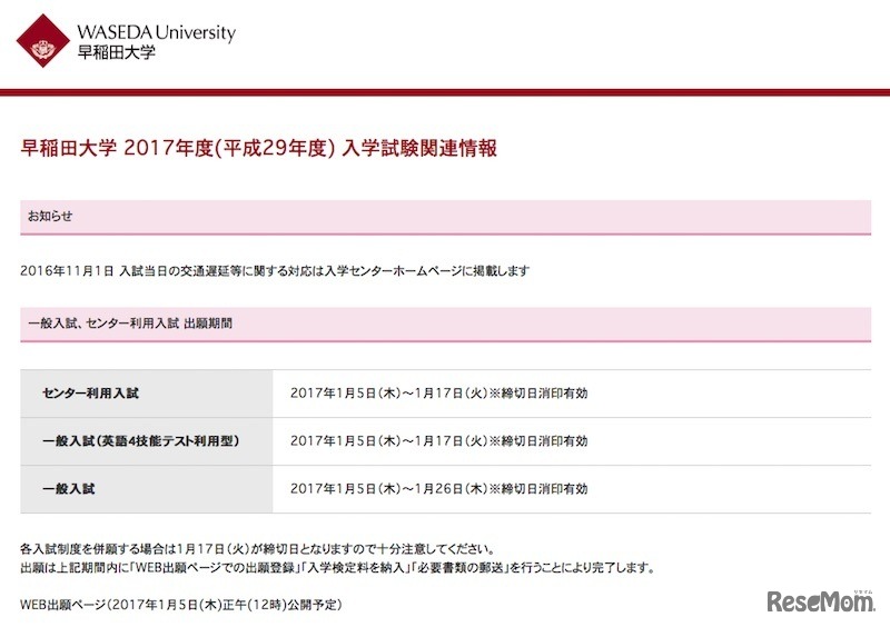 【大学受験2017】早大が入試要項を公表、1/5から出願受付 2枚目の写真・画像