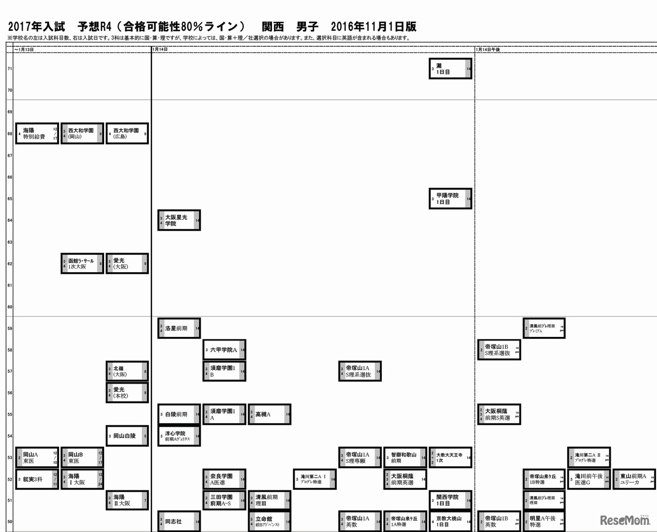 日能研は11月4日、「2017年中学入試予想R4一覧」首都圏10月21日版と関西11月1日版を公開した。合格可能性80%ラインの偏差値は、開成(72)、筑波大駒場(73)、桜蔭(68)、豊島岡(68)、女子学院(66)など。