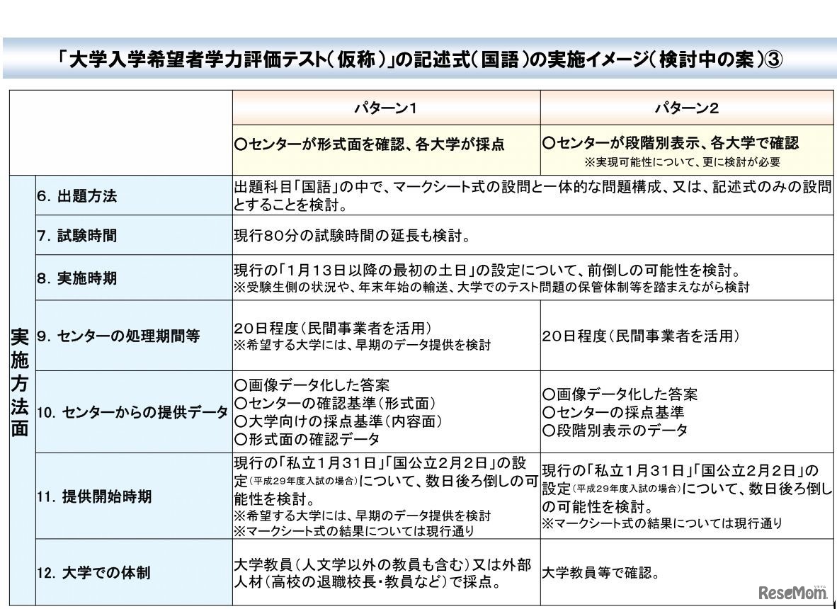 文部科学省は11月4日、「大学入学希望者学力評価テスト(仮称)」について、国語の記述式の実施イメージを明らかにした。2つのパターンを国立大学協会に提示し、各大学の意見を聞きながら検討を深めるとしている。
