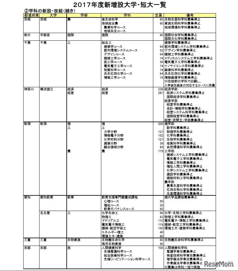 2017年度新設増設大学・短大一覧(一部)
