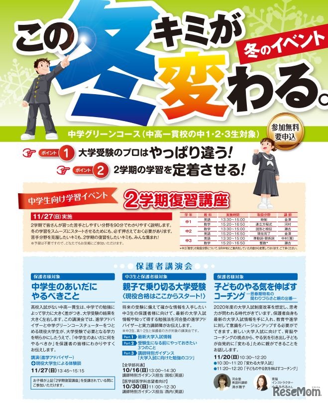河合塾進学研究社は、中高一貫校に通う中学生の保護者を対象とした講演会「中学生のあいだにやるべきこと」を11月27日に神戸三宮現役館で実施する。また、中高一貫校の中学生向けには2学期復習講座を行う。いずれも参加費無料。