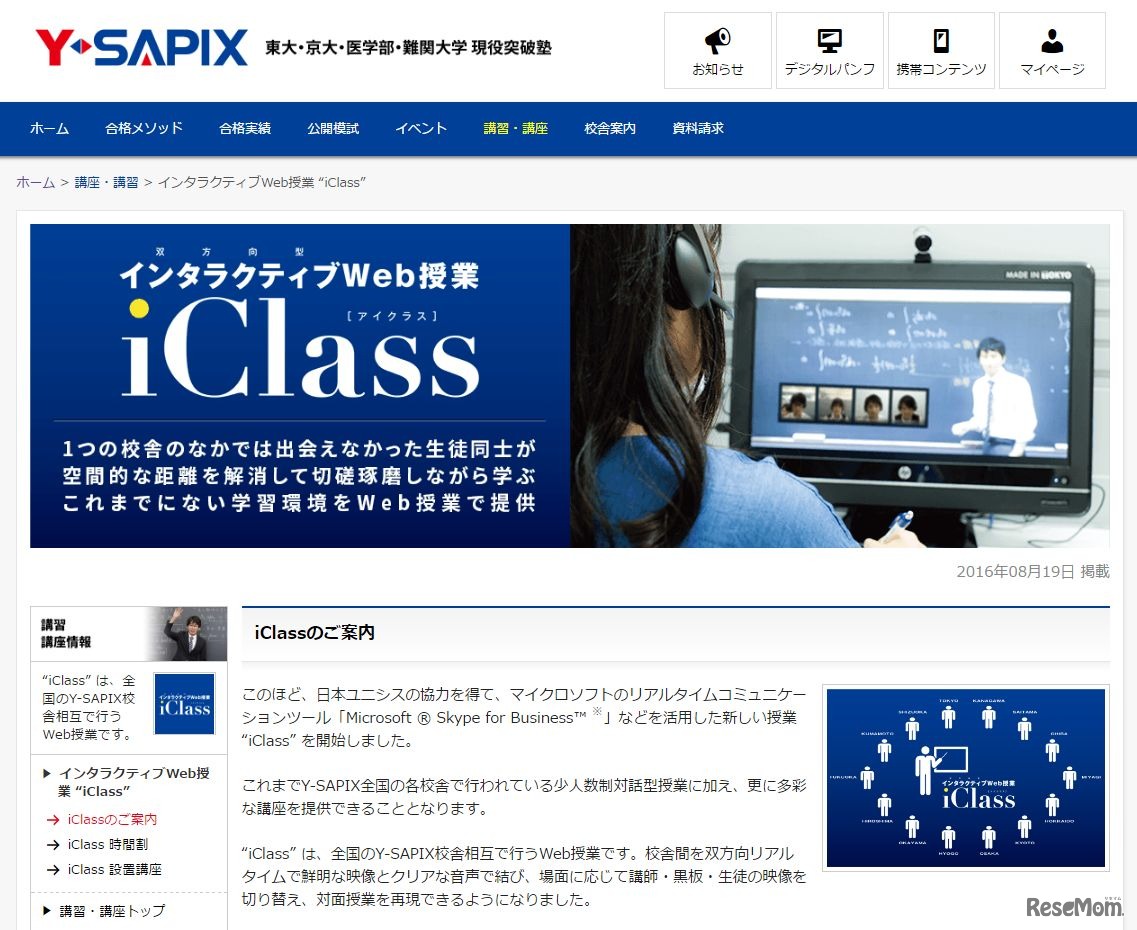 大学受験現役生専門塾Y-SAPIXは11月7日、自宅で双方向による少人数制授業が受けられる「iClass mySpace」(アイクラス マイスペース)を開始すると発表した。12月1日より受付を開始し、2017年1月9日より授業を開始する。