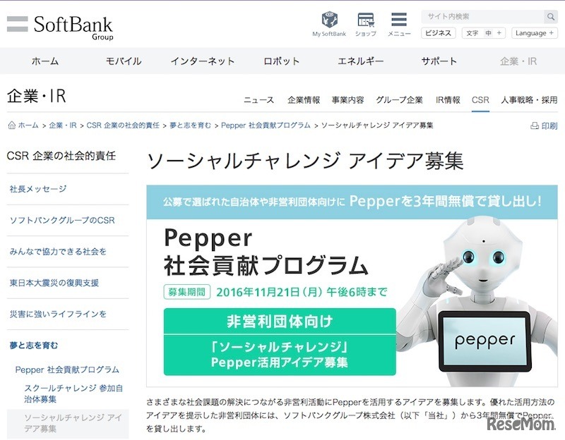 ソフトバンクグループは2017年3月より、人型ロボット「Pepper」を3年間貸し出す「Pepper社会貢献プログラム」を開始する。対象は自治体および非営利団体で、「スクールチャレンジ」では公立小中学校でプログラミング授業を実施する自治体を募集。応募は11月21日まで。