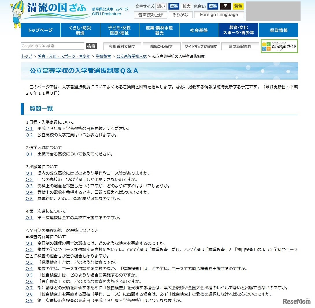岐阜県は平成28年11月8日、平成29年度(2017年度)岐阜県公立高校入試に関する入学者選抜制度Q&Aコーナーを更新した。全日制過程における第一次選抜の検査期日は平成29年3月9日。