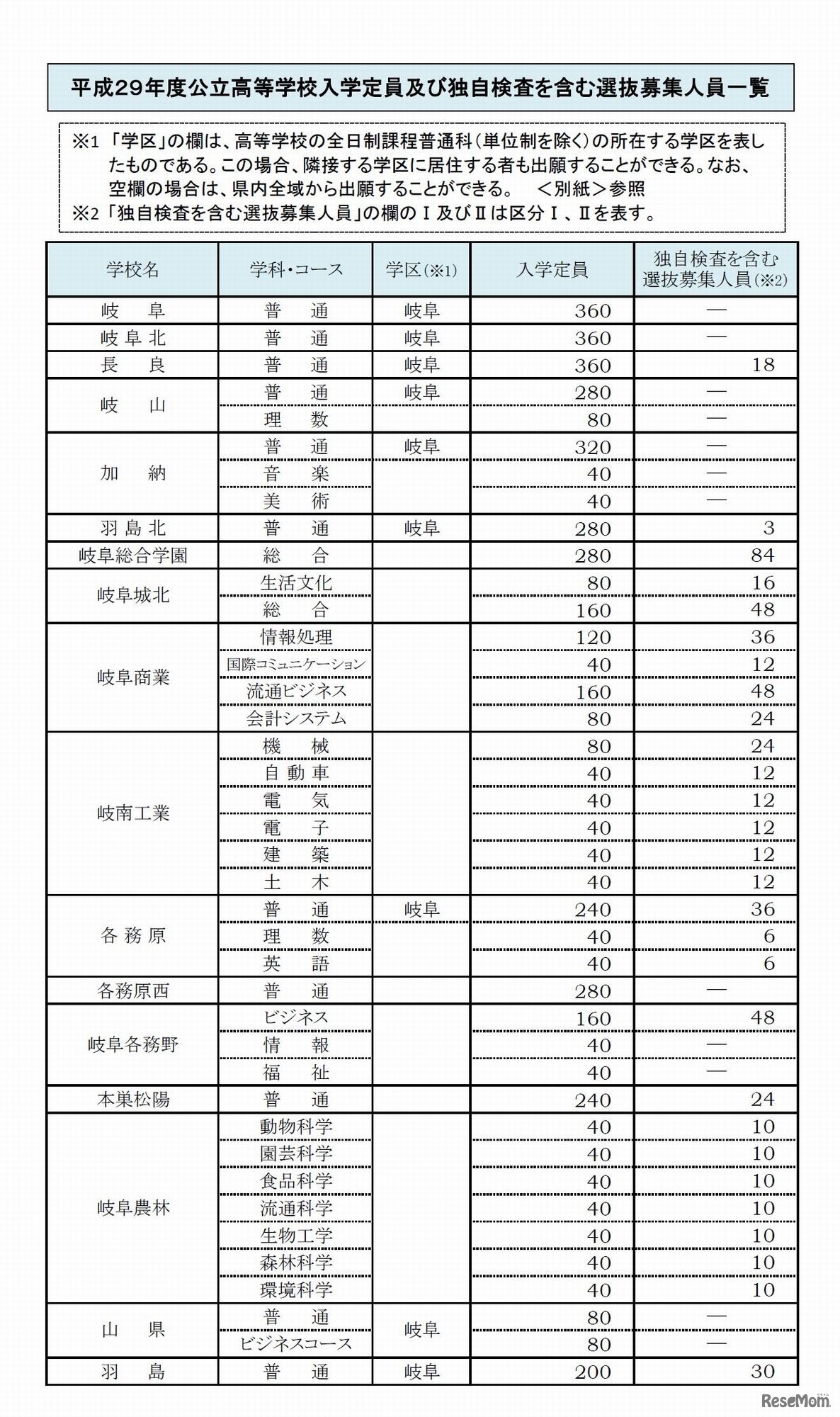 平成29年度(2017年度)岐阜県公立高校入試 入学定員および独自検査を含む選抜募集人員一覧(県立全日制)