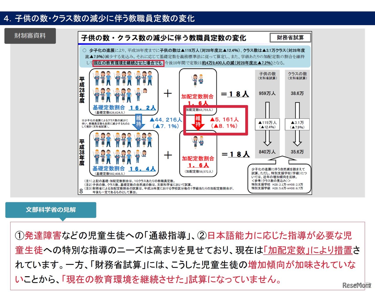 文部科学省は11月8日、財政制度等審議会財政制度分科会(財制審)が11月4日に主張した教職員定数を約4万9,400人削減する案に対する意見を公開。財制審が公表した資料には「誤解や事実誤認に基づく記述」があるとし、文科省の考えを示した。