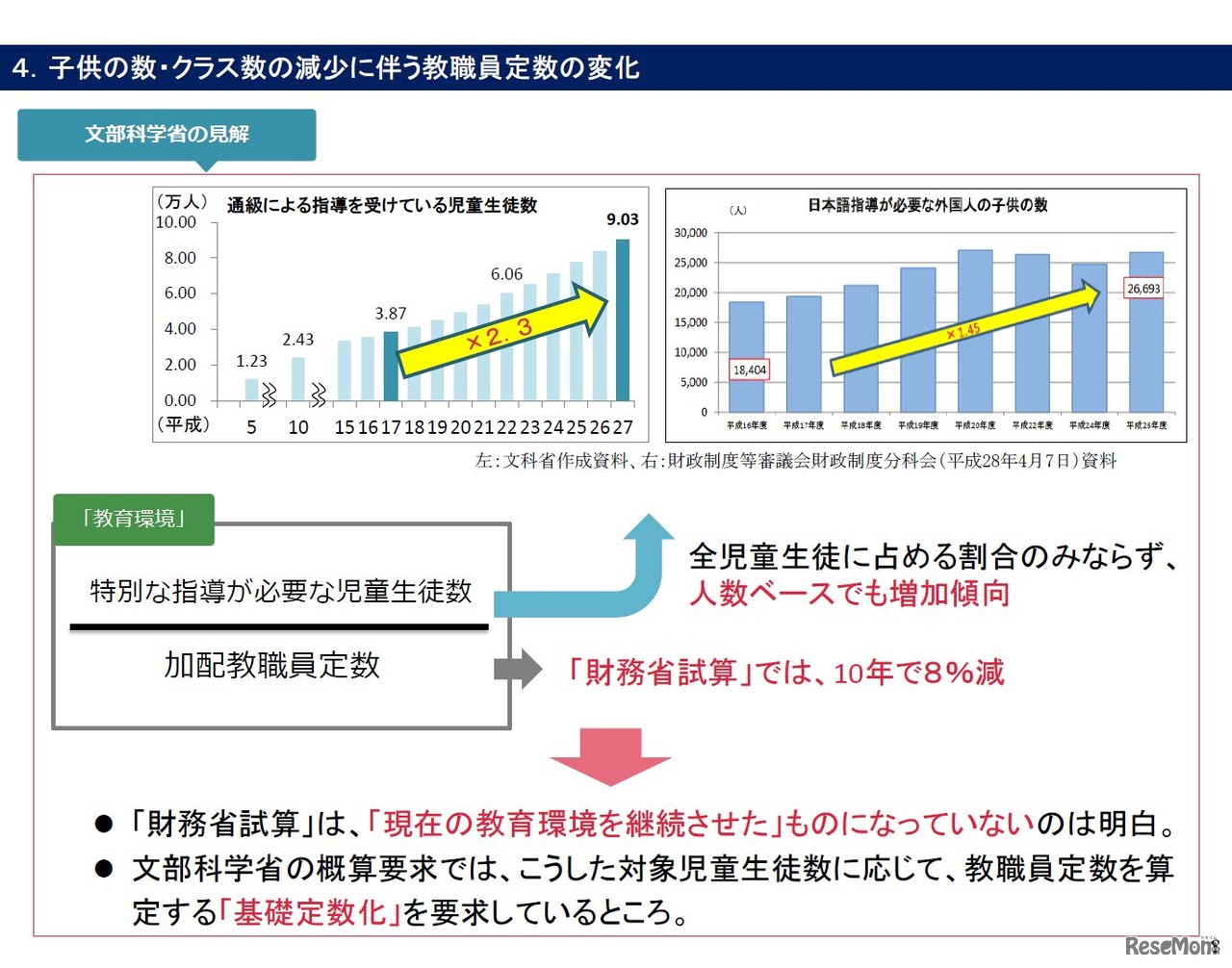 文部科学省は11月8日、財政制度等審議会財政制度分科会(財制審)が11月4日に主張した教職員定数を約4万9,400人削減する案に対する意見を公開。財制審が公表した資料には「誤解や事実誤認に基づく記述」があるとし、文科省の考えを示した。