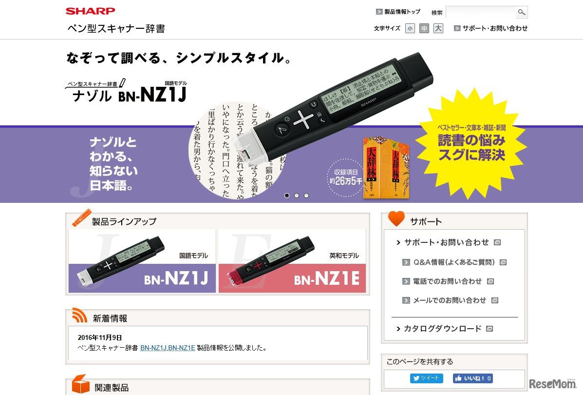 シャープは、わからない言葉をなぞるだけで意味を調べられるペン型スキャナー辞書「ナゾル」2機種を発売する。BN-NZ1J(国語モデル)、BN-NZ1E(英和モデル)ともにオープン価格。12月8日に発売予定。
