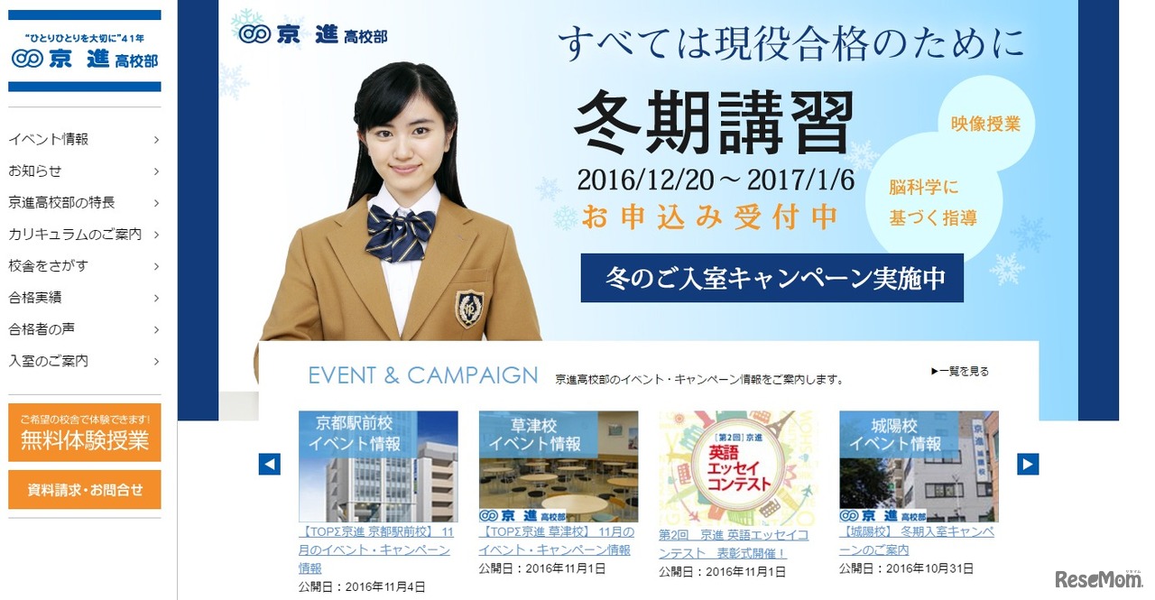 京都・滋賀・愛知を中心に学習塾を展開する京進は、センター試験当日の2017年1月14日と15日、「センター入試リアルタイム受験」を開催する。対象者は高校1、2年生と中高一貫校の中学3年生。本番のセンター試験と同じ問題にチャレンジし、受験をシミュレーションできる。