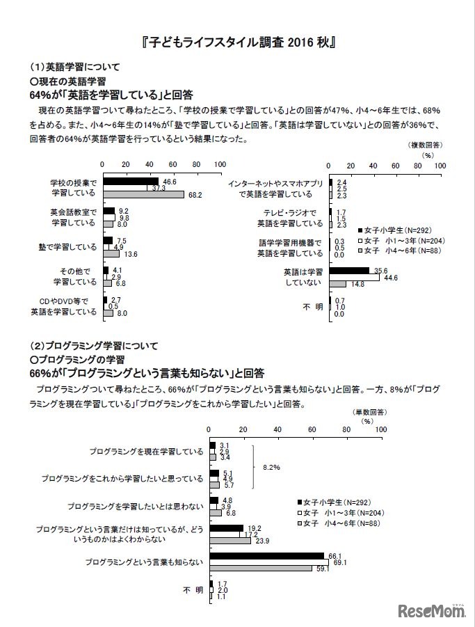 「子どもライフスタイル調査 2016 秋」 英語学習について