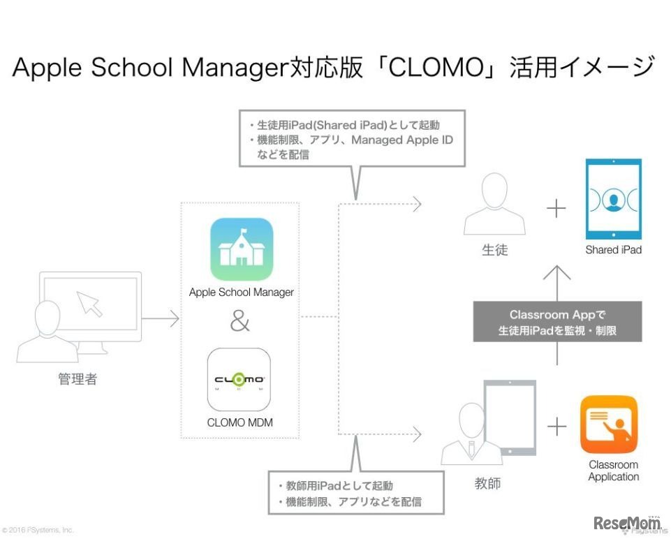 アイキューブドシステムズは、Appleが教育機関向けに提供するWebベースの管理機能「Apple School Manager」に対応したモバイル機器管理サービス「CLOMO MDM」を11月下旬に提供開始する。これを利用すれば、生徒のiPadを遠隔で一括管理できる。