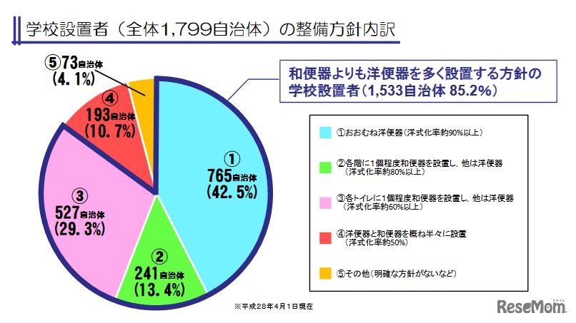 文部科学省は11月10日、「公立小中学校施設のトイレの状況調査」の結果を公表した。公立小中学校におけるトイレの便器は、和便器が56.7%を占めた一方、洋便器を多く設置する方針とした学校設置者は85.2%にのぼった。