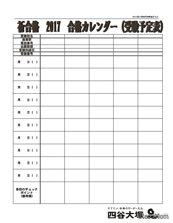 四谷大塚は、2016年11月13日に実施した「第5回合不合判定テスト」の参加者に配布した資料をWebサイトで公開した。入試直前の注意点として、本番までのスケジュールやカレンダーの作成方法、願書の書き方など、受験を具体的にイメージできるようにまとめている。