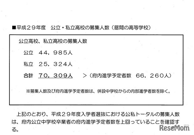 大阪府公私立高等学校連絡協議会は11月14日、平成29年度入学者選抜における公立・私立高校の募集人数に関する協議の結果を公表した。府内の進学予定者数6万9,040人に対して、平成29年度の府内高校の募集人数は公立4万4,985人、私立2万5,324人となった。