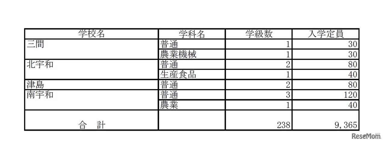 平成29年度(2017年度)愛媛県立高校入学定員 全日制
