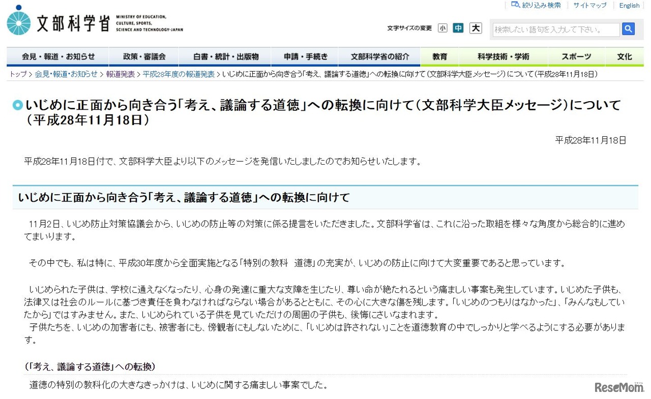 松野博一文部科学大臣は11月18日、学校の先生に向けて、いじめに正面から向き合う「道徳と教育に関する大臣メッセージ」を発表した。道徳の授業で、いじめに関する具体的な事例を取り上げ、子どもたちが考え、議論する授業を積極的に行ってほしいと要請した。