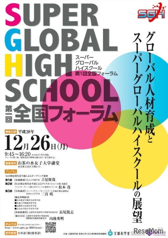 文部科学省は12月26日、筑波大学と共催で「スーパーグローバルハイスクール第1回全国フォーラム」を開催する。平成28年度のSGH中間評価において、特に優れた取組みと認められた指定校の成果などを共有するとともに、高校生に未来を語ってもらう場を設ける。参加費は無料。