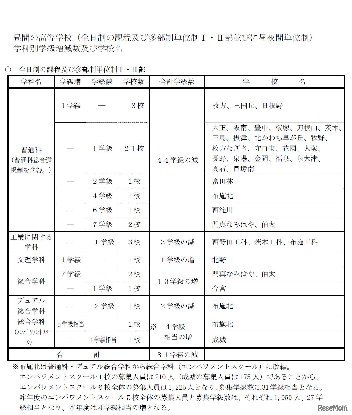 大阪府教育庁は平成28年11月18日、平成29年度(2017年度)大阪府公立高等学校募集人員を発表した。募集人員は平成28年度(2016年度)から1,185人減少し4万4,985人。募集学級数は全日制の課程および多部制単位制I・II部昼夜間単位制合わせ30学級減の1,125学級。
