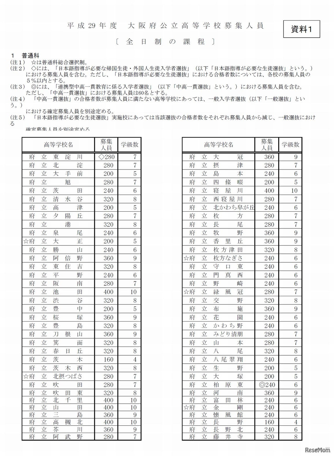 大阪府教育庁は平成28年11月18日、平成29年度(2017年度)大阪府公立高等学校募集人員を発表した。募集人員は平成28年度(2016年度)から1,185人減少し4万4,985人。募集学級数は全日制の課程および多部制単位制I・II部昼夜間単位制合わせ30学級減の1,125学級。