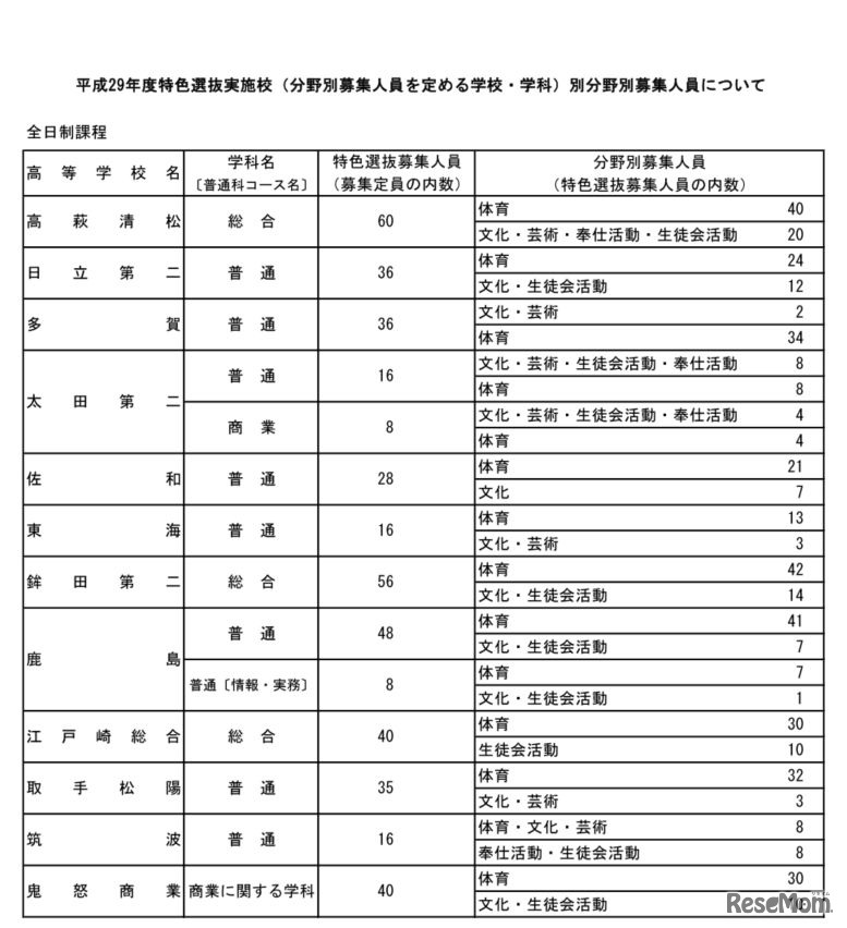 特色選抜実施校分野別募集人員