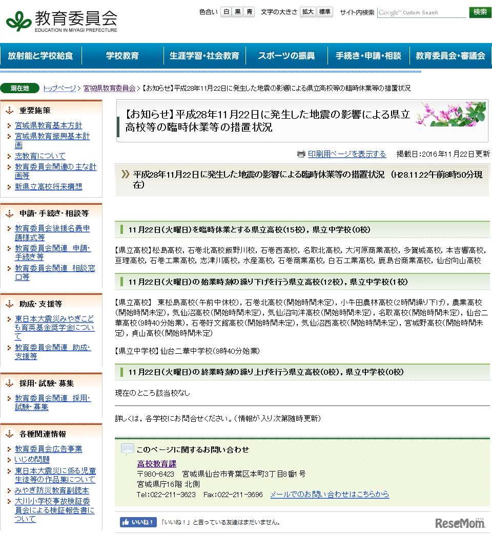 11月22日午前5時59分ごろ、福島県沖を震源とする地震が発生。午前8時14分には宮城県、福島県に津波警報が発令された。地震に伴い、宮城県教育委員会は地震の影響による臨時休業等の措置状況を発表。