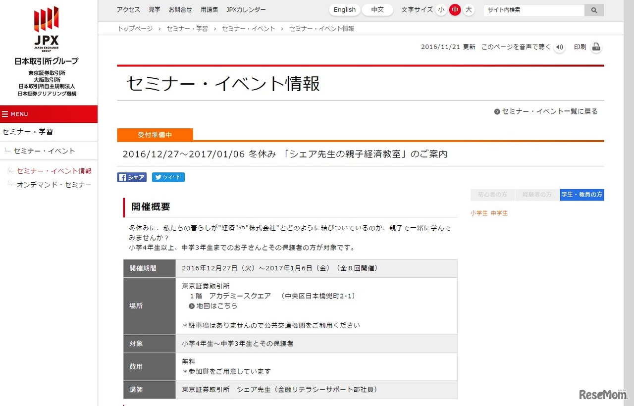 東京証券取引所では、2016年12月27日から2017年1月6日にかけて、暮らしと経済の結びつきについて学ぶ親子講座を開催する。小学4年生から中学3年生とその保護者が対象。経済教室とともに東証・日銀見学会も実施する。参加は無料。