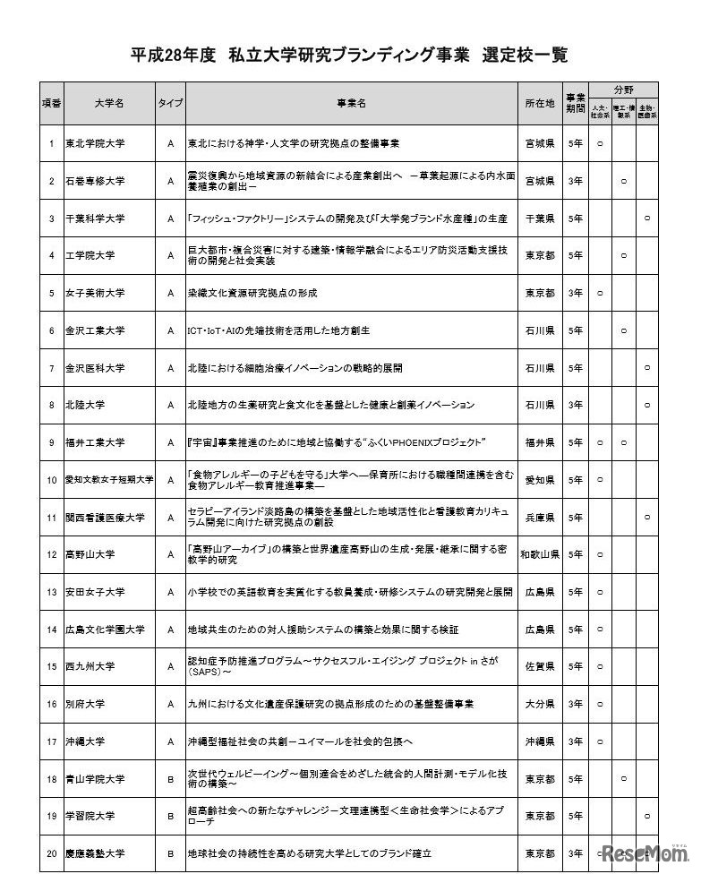 文部科学省は、平成28年度「私立大学研究ブランディング事業」の支援対象校の選定結果を公表した。申請のあった198校から審査で、慶應義塾大学、明治大学、上智大学など40校が選定された。