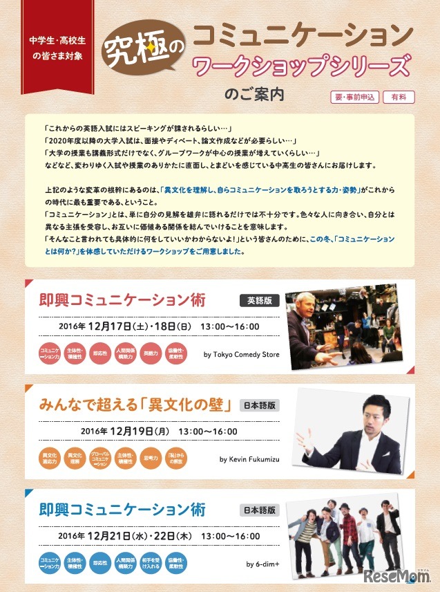 Z会グループの基盤学力総合研究所は12月、「究極のコミュニケーションワークショップシリーズ」を開催する。中高生を対象に、即興演劇パフォーマーらによる3種類の講座を実施する。申込みは、Webサイトより12月12日まで受け付けている。