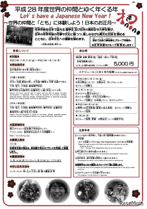 国立青少年教育振興機構は、12月30日~1月2日に開催する平成28年度「世界の仲間とゆく年くる年」の参加者を募集。対象は高校生と大学生等で、留学生と一緒に文化体験などをして日本の正月を迎える。会場は国立オリンピック記念青少年総合センター。