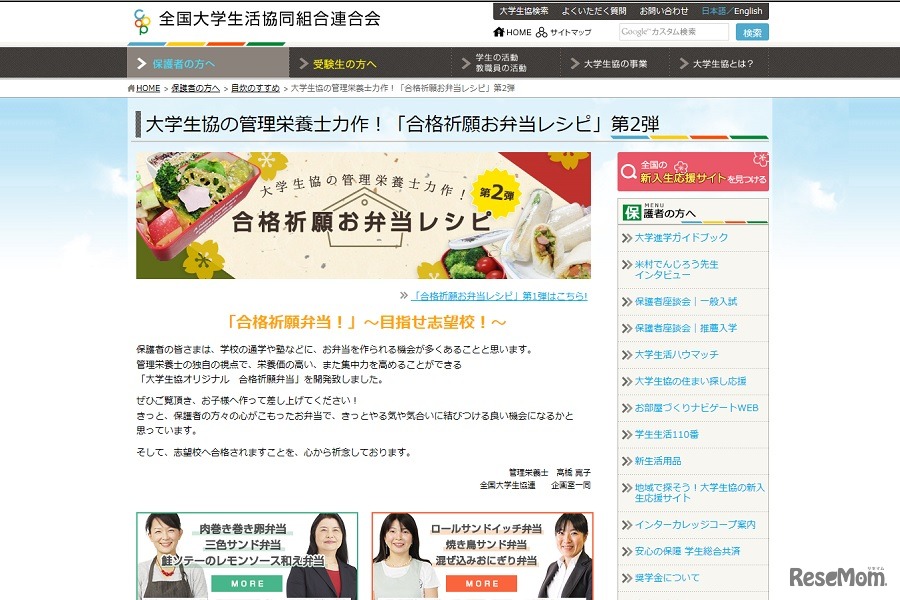 大学生協の管理栄養士力作!「合格祈願お弁当レシピ」第2弾 画像:全国大学生活協同組合連合会(大学生協)Webサイト