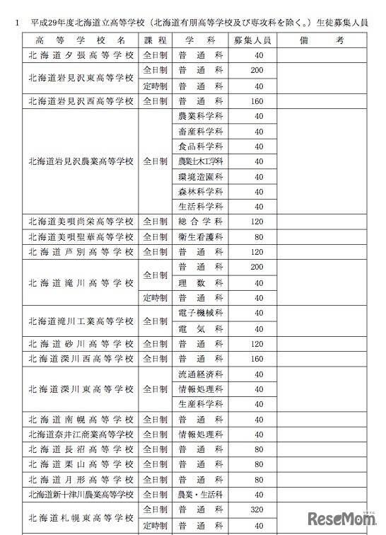 北海道教育委員会は平成28年11月22日、平成29年度(2017年度)北海道立高等学校の生徒募集人員について発表した。札幌北(普通)320人、札幌西(普通)320人、札幌南(普通)320人など。出願期間は平成29年1月20日から25日まで。