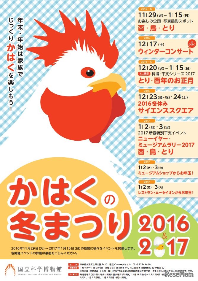 国立科学博物館は、2016年11月29日~2017年1月15日に「かはくの冬まつり2016&2017」と題して、2017年の干支である酉にちなんだ展示やクイズ、体験型のワークショップなど、さまざまなイベントを開催する。
