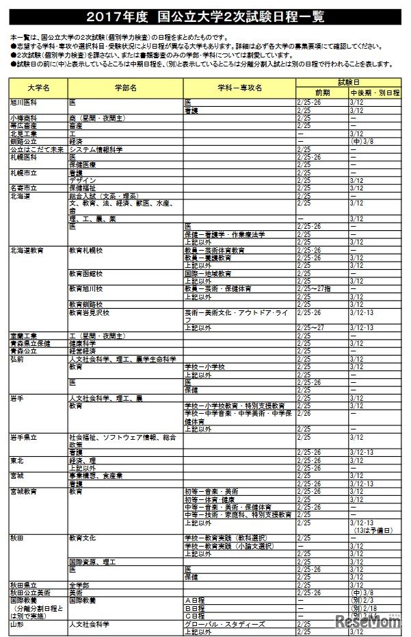2017年度国公立大学2次試験日程一覧(一部)