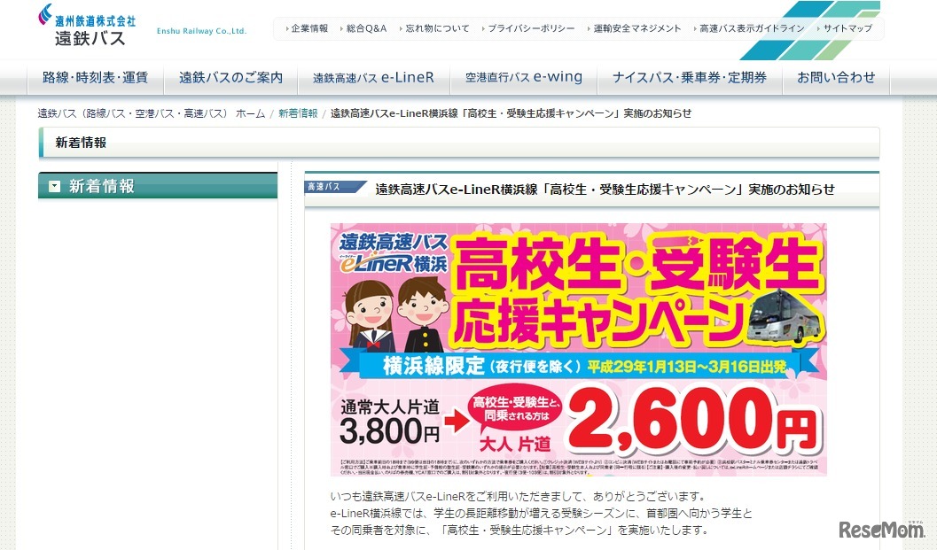 遠鉄高速バスe-LineR横浜線「高校生・受験生応援キャンペーン」