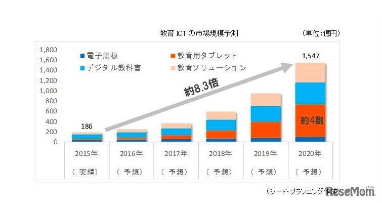 教育用ICT市場は2015年度186億円にのぼり、2020年度には2015年度比8.3倍の1,547億円が見込まれることが、シード・プランニングの市場調査レポートからわかった。また、そのうち4割強が教育用タブレットの市場となり、2020年の出荷台数は160万台と予測している。