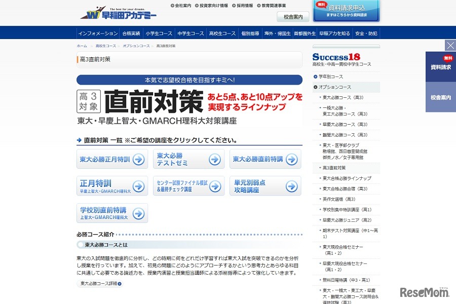 早稲田アカデミーは12月30日~2017年1月3日、高校3年生を対象とした「早慶上智大・GMARCH理科大正月特訓」を開講する。会場は、サクセス18池袋校など4校舎。受講料は塾生が7万3,800円、一般生が7万7,000円。