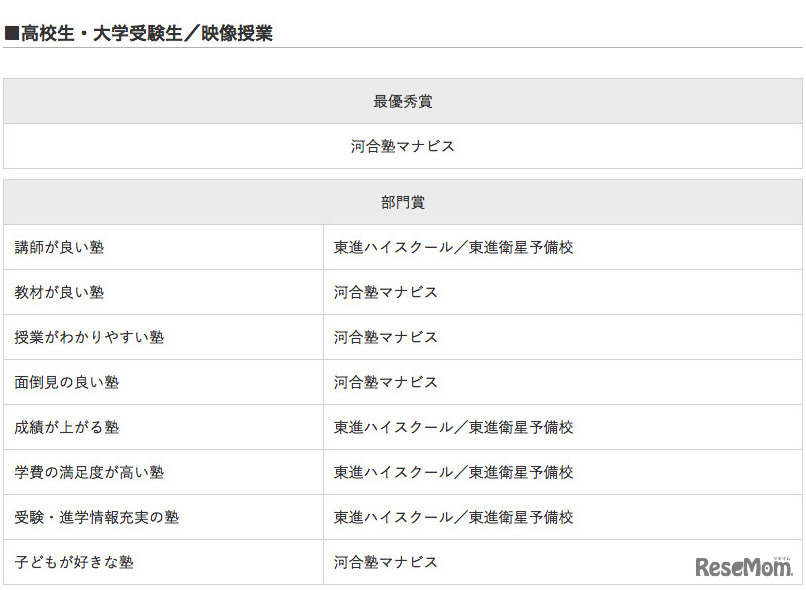 教育情報サイト「リセマム」は、塾の顧客満足度調査を実施し、イード・アワード2016「塾」を発表した。